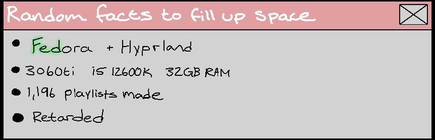 - desktop: this started out as a page to show off my desktop, pc specs (through the terminal), and my drawings. but shortly after implementing this, i switched to fedora/hyprland so it's kind of outdated. i'll likely replace it with something entirely new soon